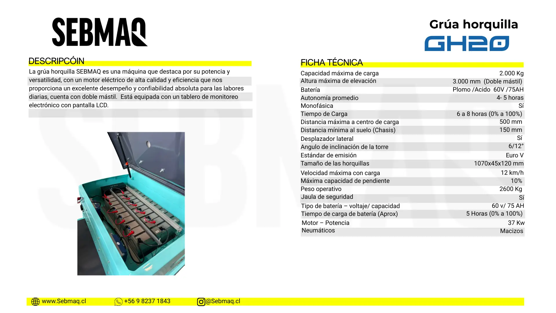 La grúa horquilla SEBMAQ es una máquina que destaca por su potencia y versatilidad, con un motor eléctrico de alta calidad y eficiencia que nos proporciona un excelente desempeño y confiabilidad absoluta para las labores diarias, cuenta con doble mástil. Está equipada con un tablero de monitoreo electrónico con pantalla LCD.