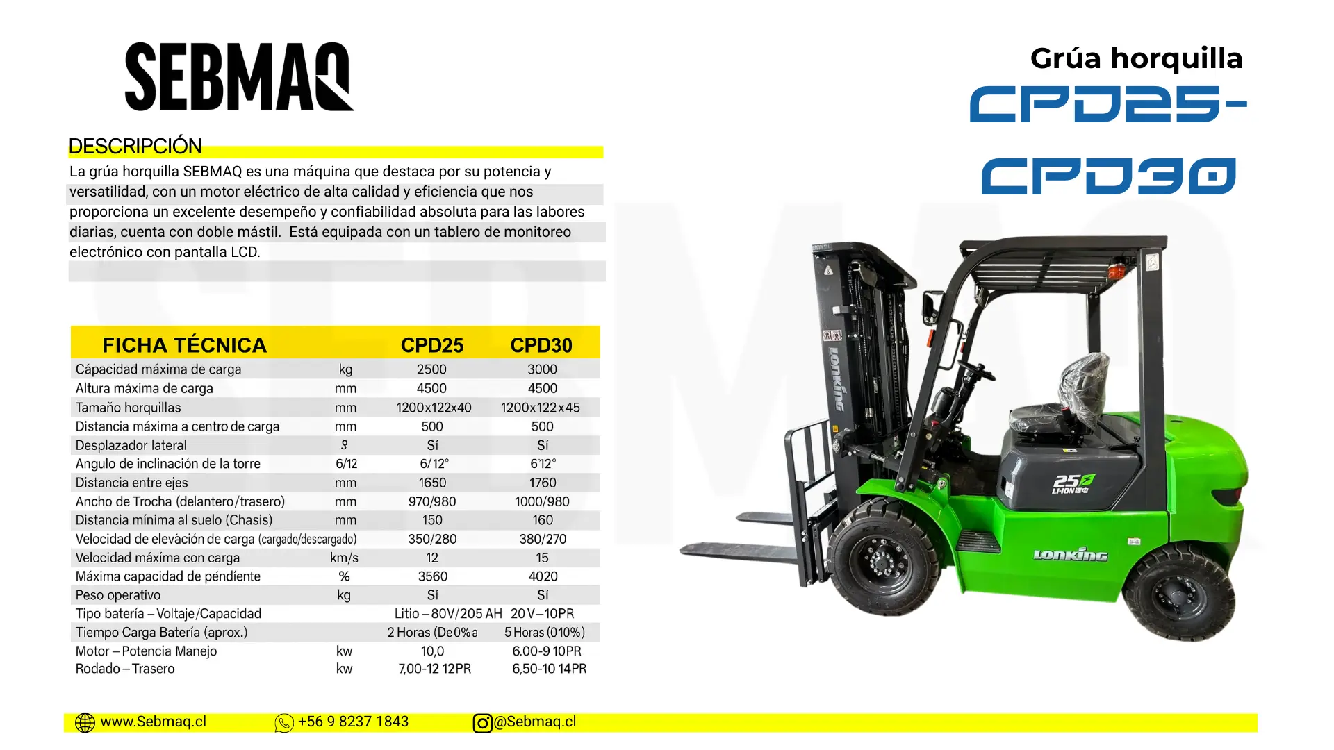 La grúa horquilla Longyan es una máquina que destaca por su potencia y versatilidad,con un motor eléctrico de alta eficiencia que nos proporciona un excelente desempeño y confiabilidad absoluta para las labores diarias, cuenta con triple mástil. Está equipada con un tablero de monitoreo electrónico con pantalla LCD.